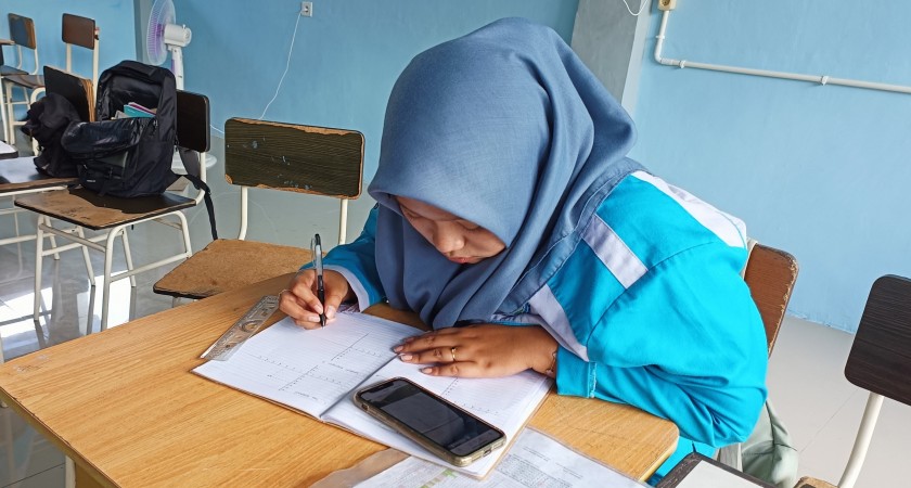 Seorang murid tampak sedang belajar di sebuah ruang. Dia tampak serius menulis di atas buku tulis. Dia juga terlihat fokus dengan pekerjaannya. Pikiranya dituangkan di buku tulis melalui sebuah pena. Proses itu terlihat wajar untuk seorang pelajar atau seorang murid. Itu memang pekerjaan utamanya yaitu belajar.
