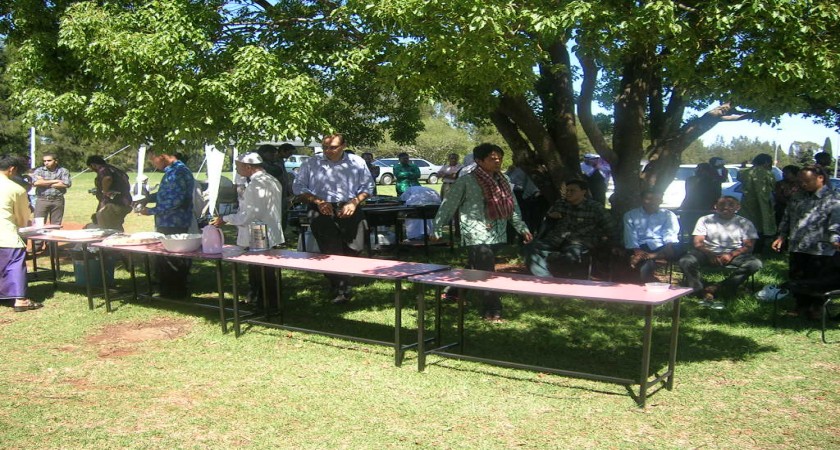 Kegiatan dilanjutkan dengan menikmati hidangan makan di halaman masjid. Ada pohon rindang dijadikan payung dalam kegiatan itu. Ditambah beberapa tenda kecil. Di situlah para jamaah mengabiskan waktu lebaran bersama. Suasana lebaran yang berbeda.